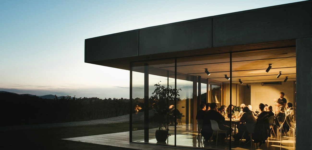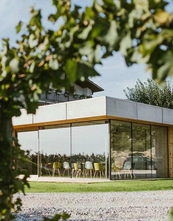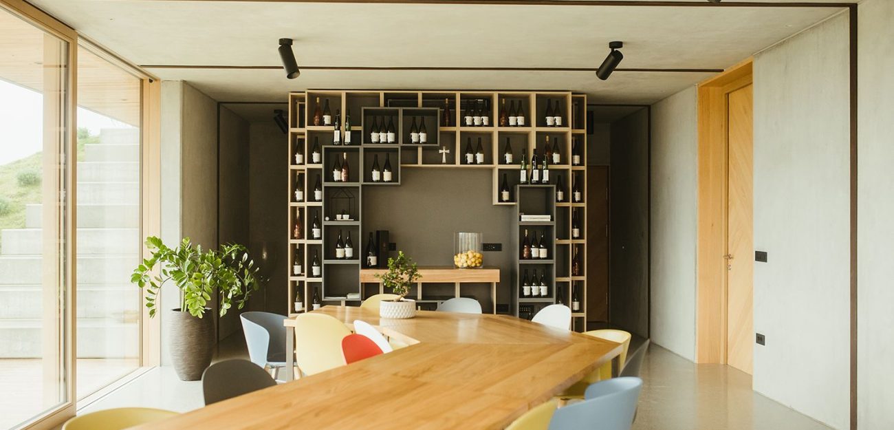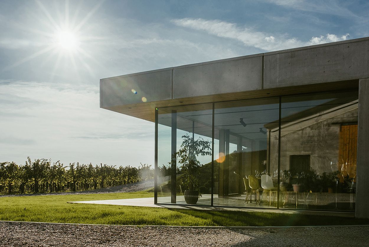 De architecten kregen de opdracht een aparte degustatieruimte te ontwerpen waar de gasten kunnen genieten van een authentieke uiteenzetting van de jonge wijnproducenten uit de Vipava-regio. De wijn en het eten zijn niet het enige waarvan de bezoekers kunnen genieten. De nieuw ontworpen ruimte opent zich namelijk naar de vallei en biedt de gasten een spectaculair uitzicht, waardoor hun ervaring helemaal compleet wordt. Het gebouw heeft een rechthoekige vorm met duidelijke lijnen. Een groot glas-op-glas hoekraam en een dakterras creëren een vloeiende overgang van binnen naar buiten. De glazen bekleding is omgeven door een zichtbare betonconstructie, terwijl de houten binnenbekleding een gevoel van warmte en gezelligheid creëert. (Foto: Nejc Bole)