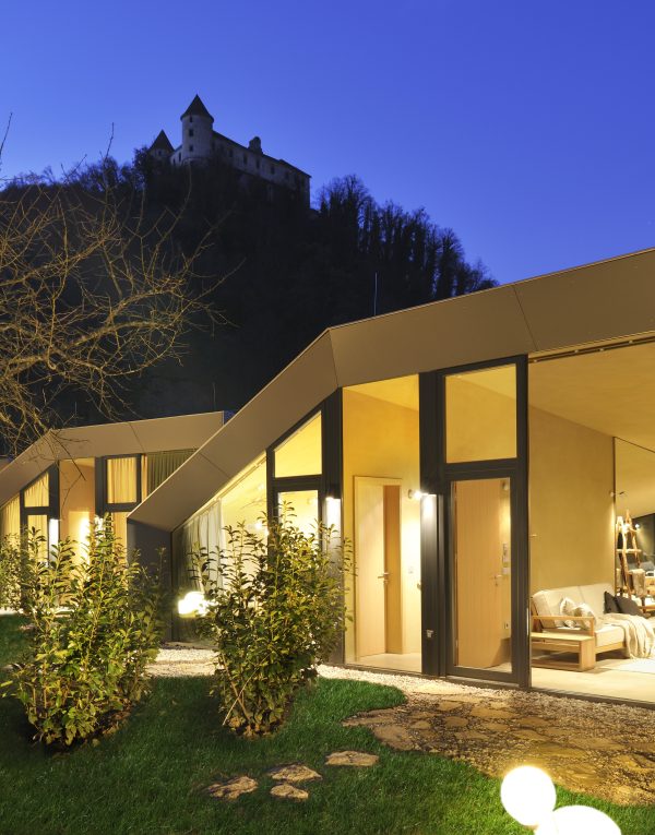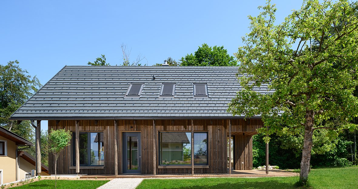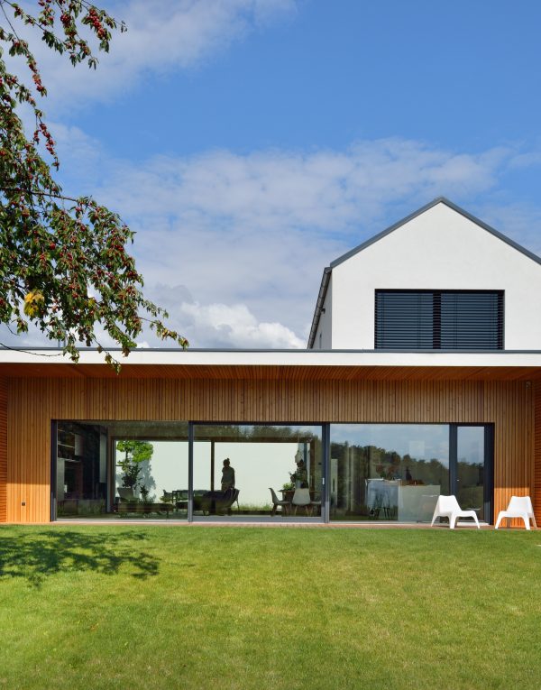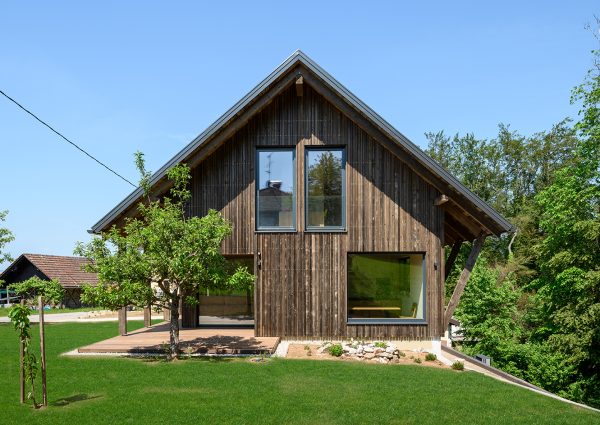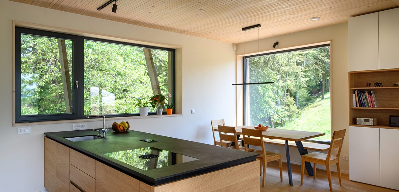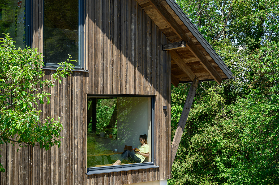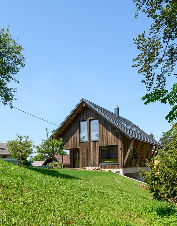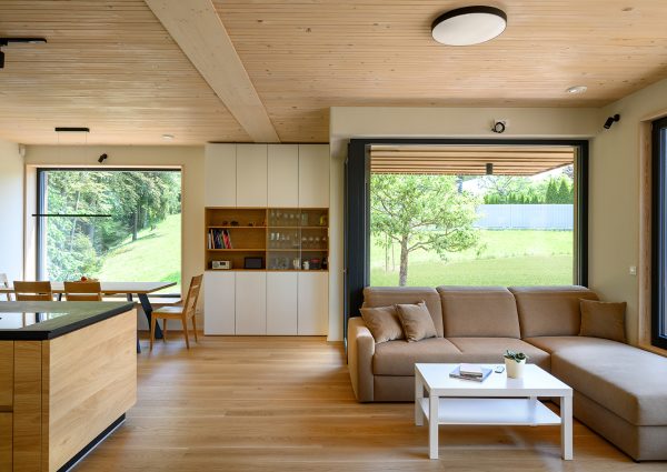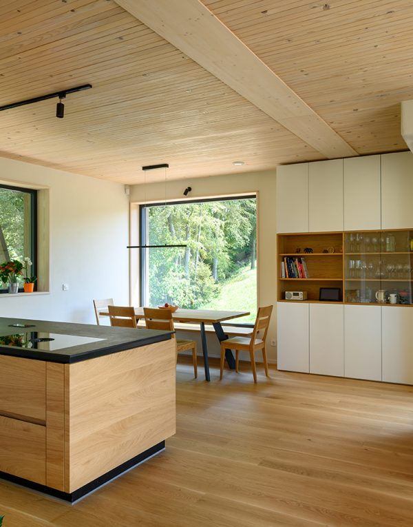 Dit huis maakt goed gebruik van de helling, met woonzones op grondniveau en serviceruimtes eronder. Het gedeelte boven de grond bestaat volledig uit een houten constructie en is bekleed met een houten wand, die is behandeld met een speciaal middel dat het vergrijzen van het hout versnelt, waardoor het hout vanaf het begin een blijvend uniforme kleur krijgt. Plaatselijk gewonnen sparren- en dennenhout en kleipleister in het interieur geven het gebouw een extra duurzame waarde. (Foto: Miran Kambič)