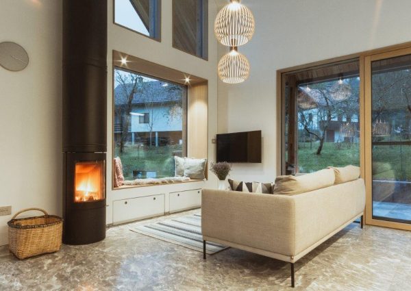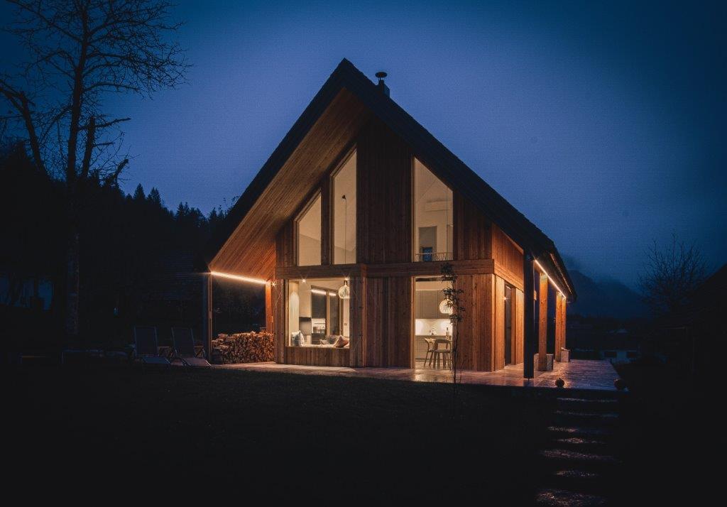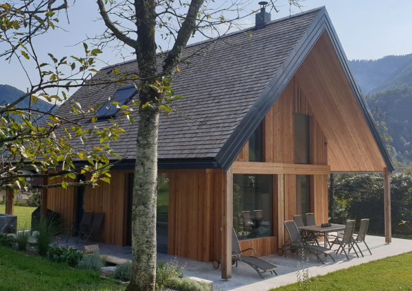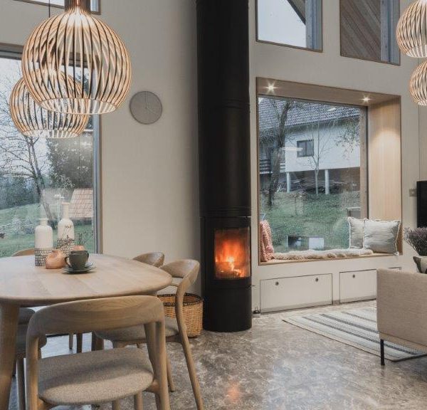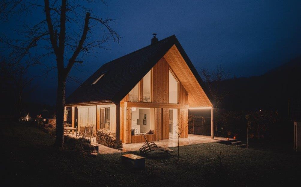 In het dialect van Kostel staat “bale, bale” voor “kom, kom”. De naam van het huis is dus een uitnodiging om te genieten van het comfort van de natuurlijke omgeving. Ondanks het eigentijdse ontwerp toont het huis respect voor de plaatselijke cultuur en het architecturale erfgoed. De dakbedekking is gemaakt van dakspanen uit drie lagen larikshout en de schuifpui is belucht met verticale latten, eveneens van larikshout. Het gebouw staat op een stenen voetstuk van Hotavlje-marmer. Een open centrale ruimte van 7,5 m hoog biedt een prachtig uitzicht op de berg Kuželjska stena. Het belangrijkste element van deze ruimte is de zwarte open haard. Als basismateriaal is in het hele huis massief eikenhout gebruikt. De eettafel, de stoelen en de salontafel onthullen het nauwkeurige vakmanschap van de timmerlieden, waardoor de kracht en de sterkte van het eikenhout worden benadrukt. Het huis is gelegen in de regio Kočevje. (Foto: Nik Grmovšek)