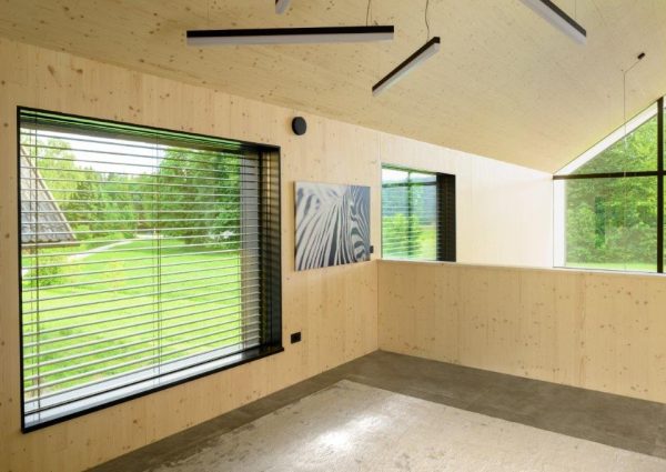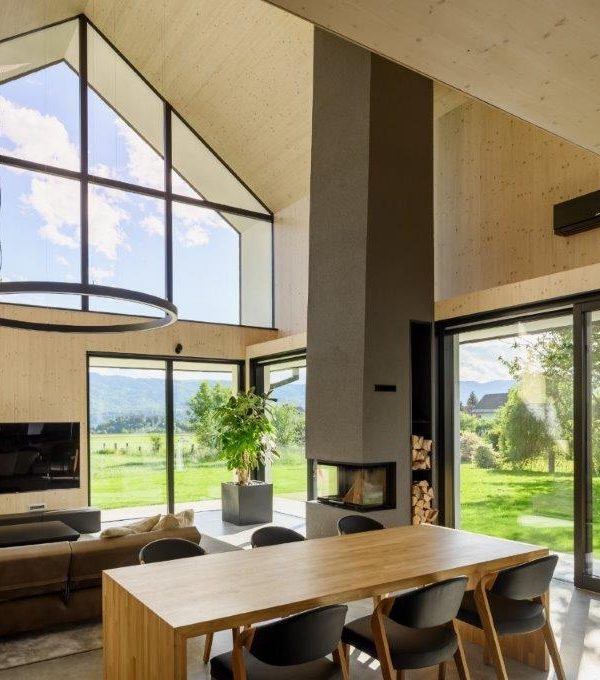 Het halfopen vloerontwerp van dit eengezinshuis C in Lesce verbindt alle privévertrekken in de woning met elkaar. Het ontwerp bestaat uit twee verdiepingen, waardoor dit verder traditionele huis luchtig en open aanvoelt en de hele dag door veel zonlicht krijgt. De verschillende zones voor het wonen en de nutsvoorzieningen zijn goed met elkaar verbonden, van de entreehal tot de keuken met de woonkamer, de garderobe en de sauna. Het huis houdt rekening met de gewoonten en de routine van de bewoners. Op de bovenverdieping bevinden zich privévertrekken – slaapkamers en badkamers. Het belangrijkste bouwmateriaal is hout, dat duidelijk zichtbaar is in het interieur. (Foto: Miran Kambič)