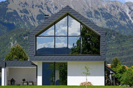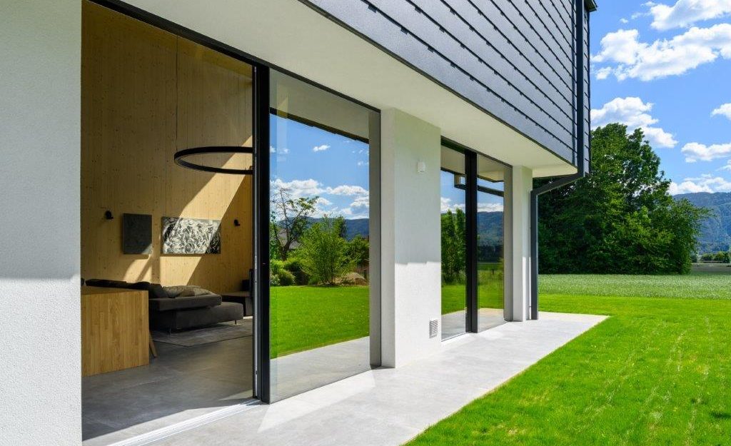 Raam voor moderne architectuur met een glazen buitenzijde: het hout is verborgen achter isolatieglas met geëmailleerde rand, wat zorgt voor een minimalistische, zuivere gevel. Binnen blijft het warme, zorgvuldig bewerkte hout zichtbaar. De oplossing biedt hoge luchtdichtheid en stabiliteit, zelfs bij grote afmetingen – een discreet maar expressief architecturaal element.