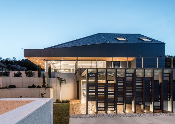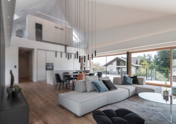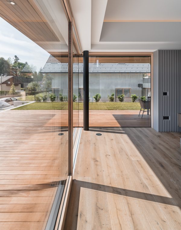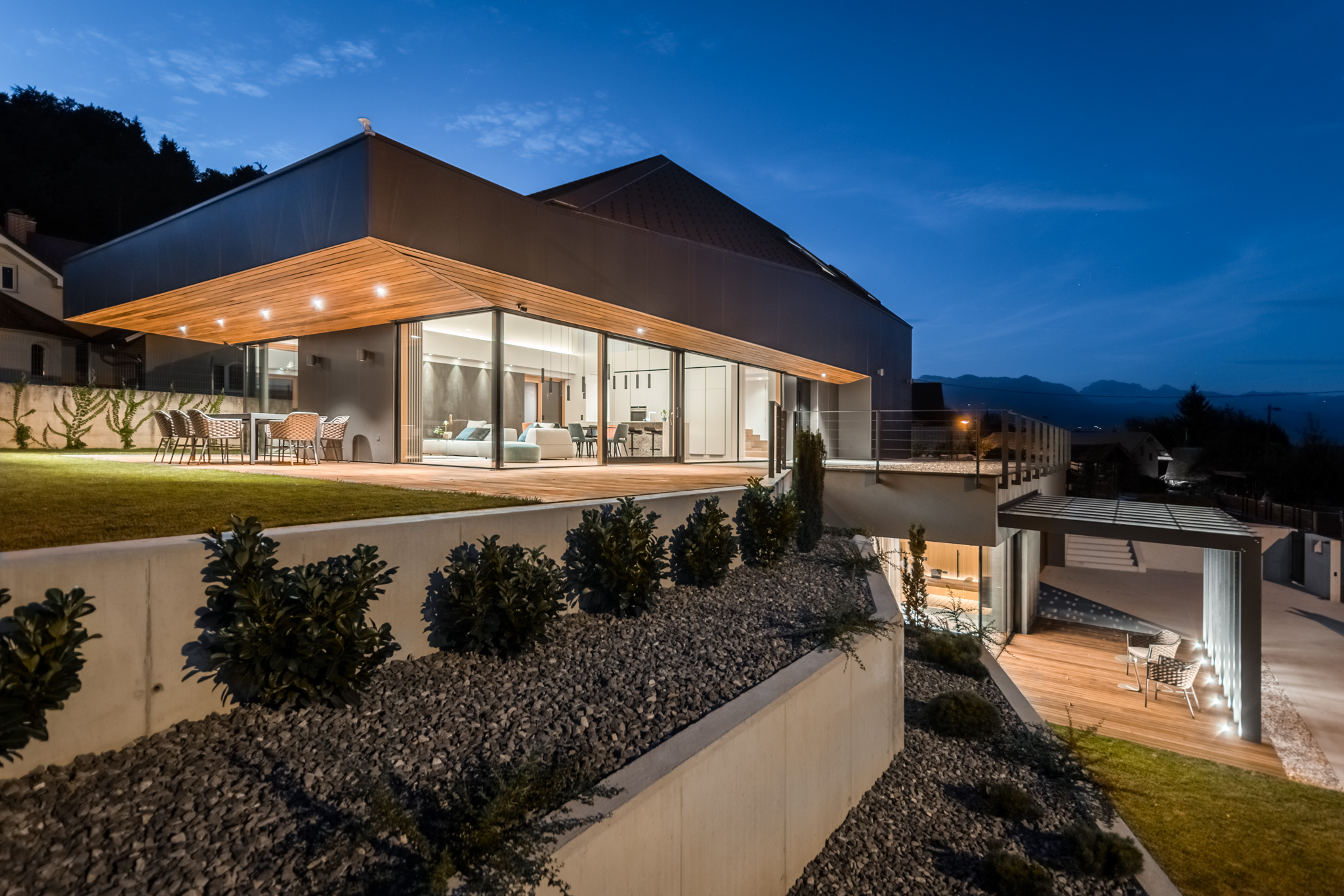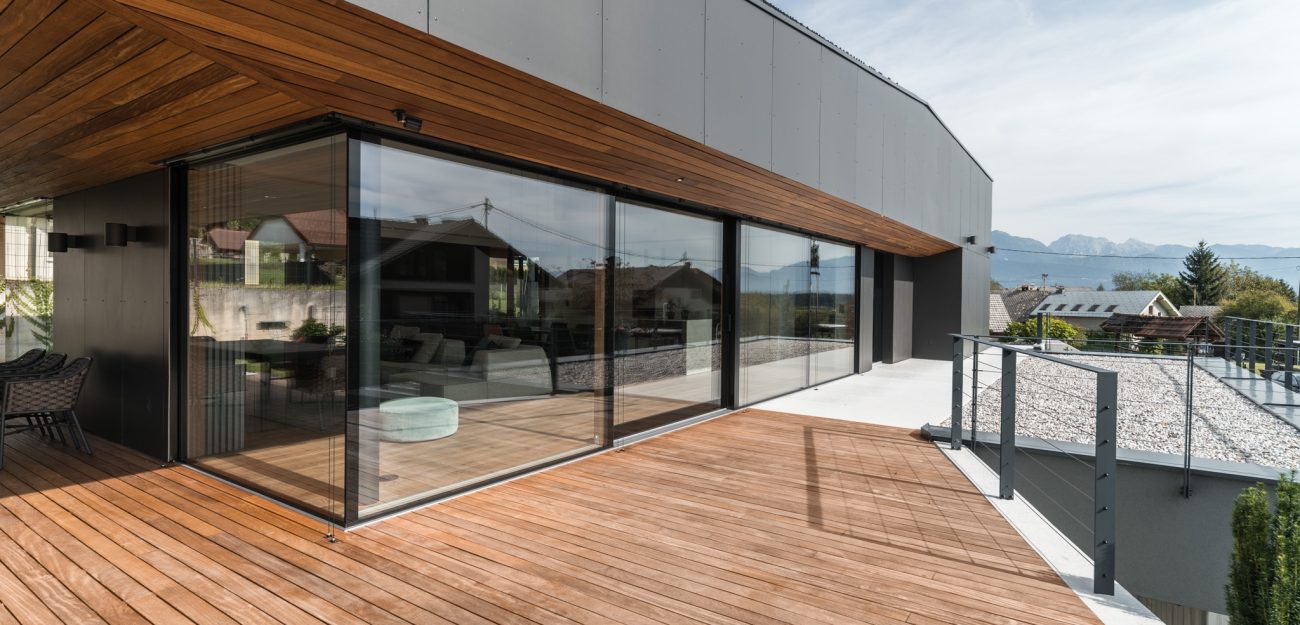 Een eigentijds gebouw in particulier bezit met grote panoramische ramen. (Foto: Jernej Lah)