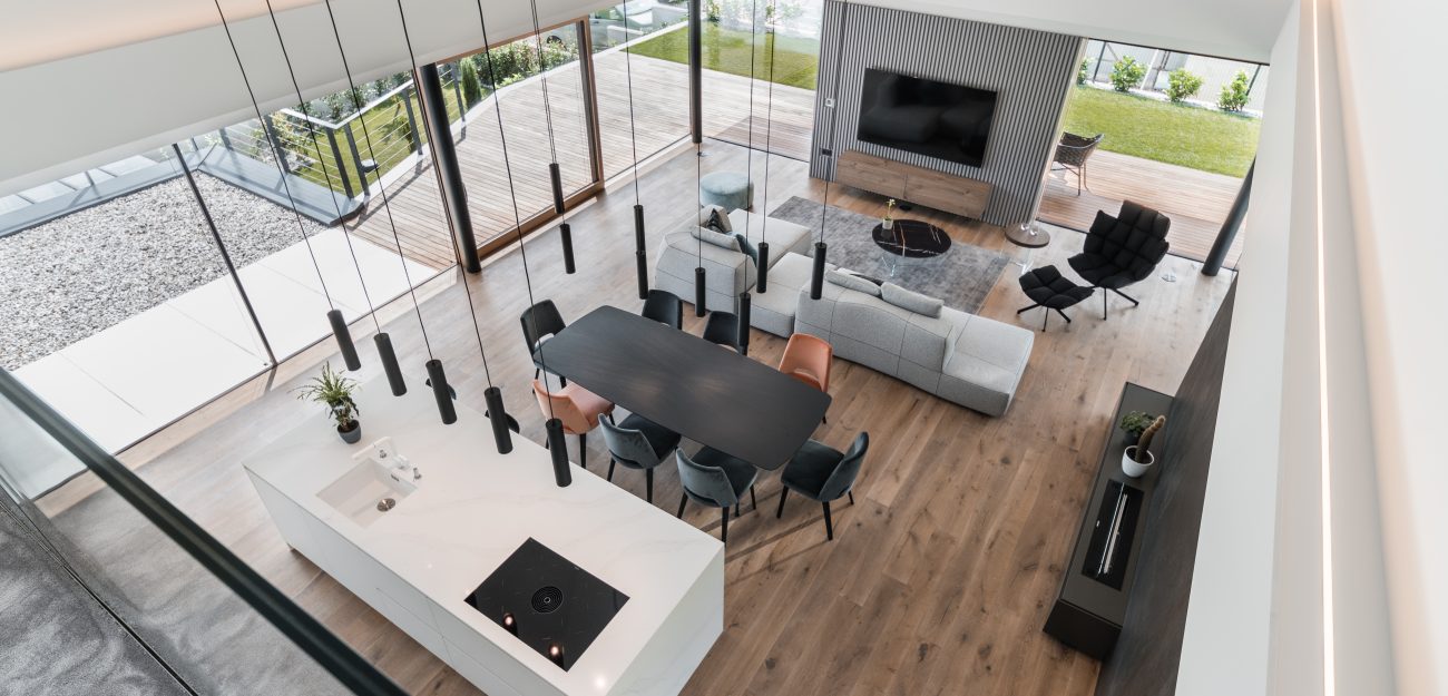 Raam voor moderne architectuur met een glazen buitenzijde: het hout is verborgen achter isolatieglas met geëmailleerde rand, wat zorgt voor een minimalistische, zuivere gevel. Binnen blijft het warme, zorgvuldig bewerkte hout zichtbaar. De oplossing biedt hoge luchtdichtheid en stabiliteit, zelfs bij grote afmetingen – een discreet maar expressief architecturaal element.