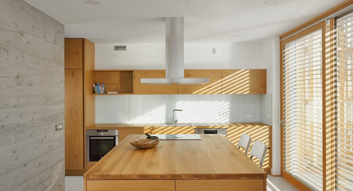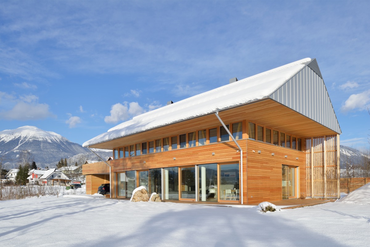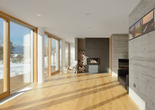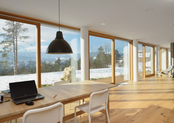 Huis L ligt aan de rand van de bebouwde kom en biedt een prachtig uitzicht op de Julische Alpen en Bled aan één kant van het huis. Het gebouw heeft ramen en panoramische deuren die uitkomen op de tuin en het bergpanorama aan de achterkant. De architecten hebben het huis echter afgesloten van de drukke straat om het tegen lawaai te beschermen. Het interieurontwerp combineert op een slimme manier beton, glas en hout, waardoor een eigentijdse en open ruimte ontstaat die heel gezellig aanvoelt. (Foto: Miran Kambič)