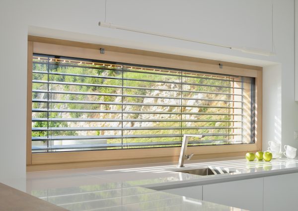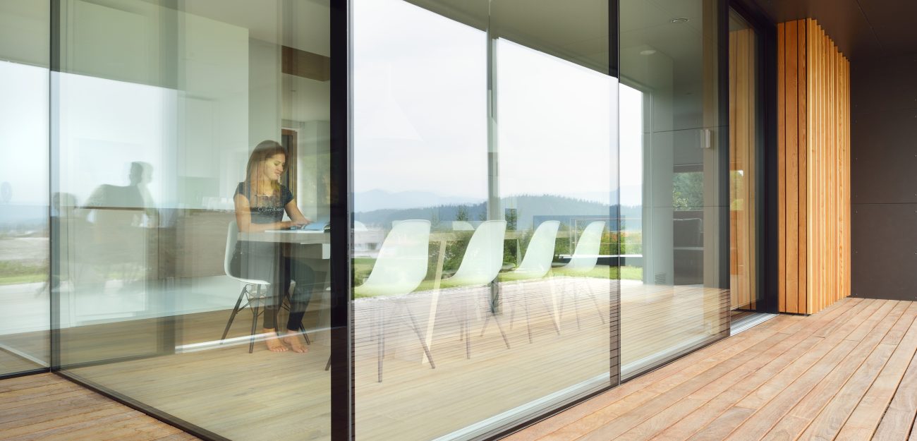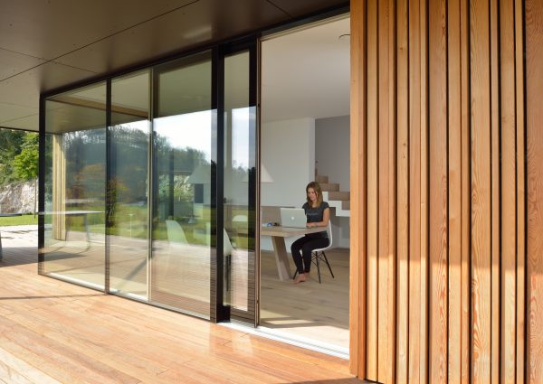Het bovenste platform creëert een privéruimte rond het huis en staat in verbinding met de woonzones via grote glazen oppervlakken.
