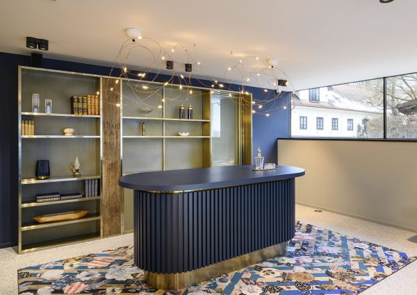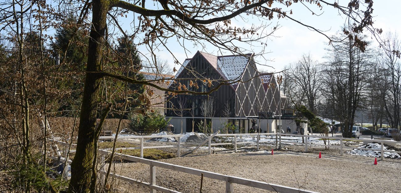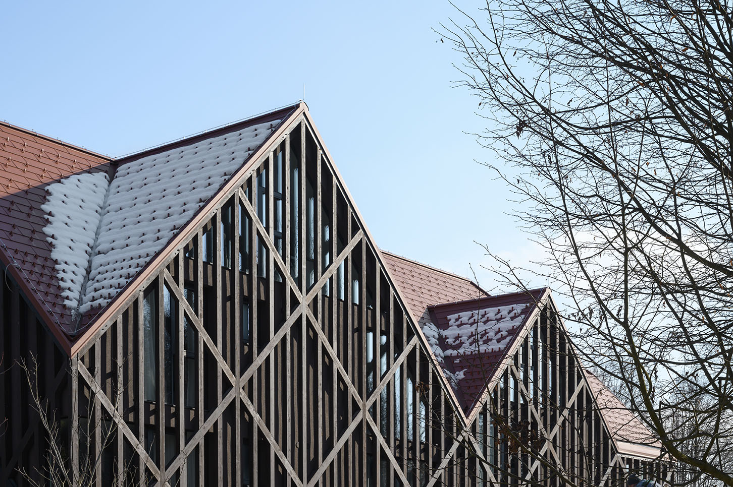 Het hotel is zo ontworpen dat de toegestane afmetingen optimaal worden benut. Een ontwerp met gedeelde niveaus en goed doordachte plattegronden maakte het mogelijk 18 hotelkamers in te richten, waarvan twee suites met een loggia en twee zelfstandige appartementen met een loggia op de zolderverdieping. De dienstruimten bevinden zich in de kelder, terwijl zich op de begane grond, die openbaar is, een halfverdiepte receptie en een café met een tuin bevinden. Het bladerdak van de omringende bomen en de zichtbare houten bouwelementen van de villa’s in de Rožna-vallei vormden de inspiratie voor het ontwerp van de zijvleugels. (Foto: Miran Kambič)